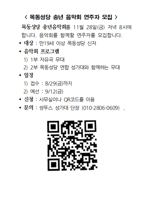 목동성당 송년 음악회 연주자 모집 페이지 정보 작성자 사무실 댓글 0건 조회Hit 710회 작성일Date 25-08-21 09:14 본문 목동성당 송년 음악회 연주자 모집 목록 이전글새 예비신자 교리반 모집 (교리실 : 바오로관 201호) 25.08.21 다음글교구 사제단 만남의 날 행사 25.08.21 댓글목록 댓글목록 등록된 댓글이 없습니다.