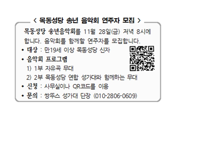목동성당 송년 음악회 연주자 모집 페이지 정보 작성자 사무실 댓글 0건 조회Hit 757회 작성일Date 25-09-04 13:15 본문 목동성당 송년 음악회 연주자 모집 목록 이전글새 예비신자 교리반 모집 (교리실 : 바오로관 201호) 25.09.04 다음글추석 연휴 미사 안내 25.09.04 댓글목록 댓글목록 등록된 댓글이 없습니다.