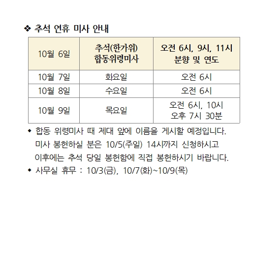 추석 연휴 미사 안내 페이지 정보 작성자 사무실 댓글 0건 조회Hit 737회 작성일Date 25-09-11 11:45 본문 추석 연휴 미사 안내 목록 이전글수녀님들이 농사지으신 3색 현미 찹쌀 판매 25.09.11 다음글전입교우 환영합니다. 25.09.11 댓글목록 댓글목록 등록된 댓글이 없습니다.