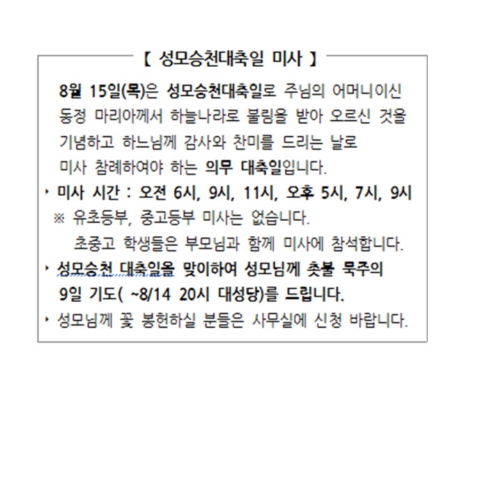 성모승천대축일 미사 페이지 정보 작성자 사무실 댓글 0건 조회Hit 2,285회 작성일Date 24-08-08 10:10 본문 성모승천대축일 미사 목록 이전글추석 연휴 미사 안내 24.08.14 다음글혹서기 전례 안내 24.07.24 댓글목록 댓글목록 등록된 댓글이 없습니다.