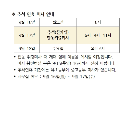 추석 연휴 미사 안내 페이지 정보 작성자 사무실 댓글 0건 조회Hit 1,994회 작성일Date 24-08-29 09:23 본문 추석 연휴 미사 안내 목록 이전글9월 첫 첨례 안내 24.08.29 다음글강귀석(아우구스티노) 주임신부님 영명축일 24.08.22 댓글목록 댓글목록 등록된 댓글이 없습니다.