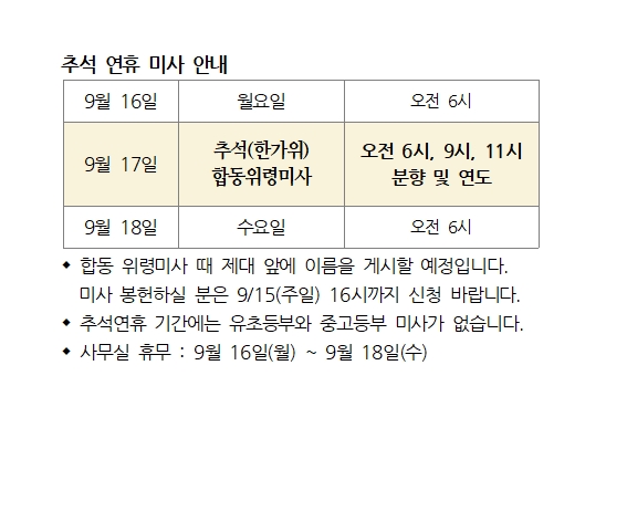 추석 연휴 미사 안내 페이지 정보 작성자 사무실 댓글 0건 조회Hit 1,894회 작성일Date 24-09-11 14:48 본문 추석 연휴 미사 안내 목록 이전글한가위 명절 즐겁게 보내시고, 모든 가정에 주님의 사랑과 축복이 가득하시기를 기원합니다! 24.09.11 다음글빛사모 (사진동호회) 사진전 24.09.11 댓글목록 댓글목록 등록된 댓글이 없습니다.