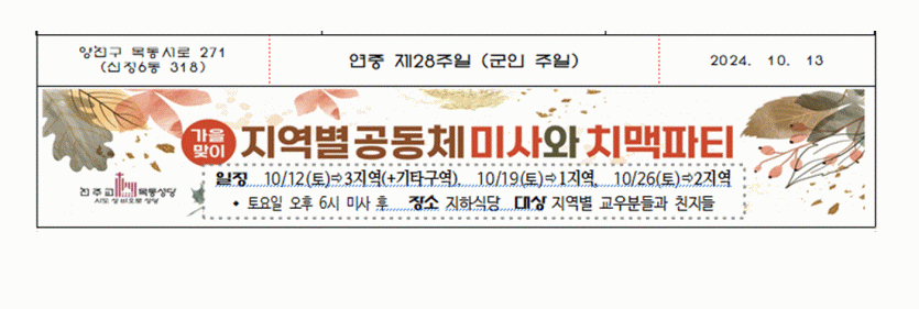 가을맞이 지역별공동체미사와 치맥파티 페이지 정보 작성자 사무실 댓글 0건 조회Hit 1,993회 작성일Date 24-10-10 10:43 본문 가을맞이 지역별공동체미사와 치맥파티 목록 이전글위령의 날 합동 위령미사 24.10.16 다음글이경상 바오로 주교님과 함께하는 18지구 청소년•청년 미사 24.10.10 댓글목록 댓글목록 등록된 댓글이 없습니다.