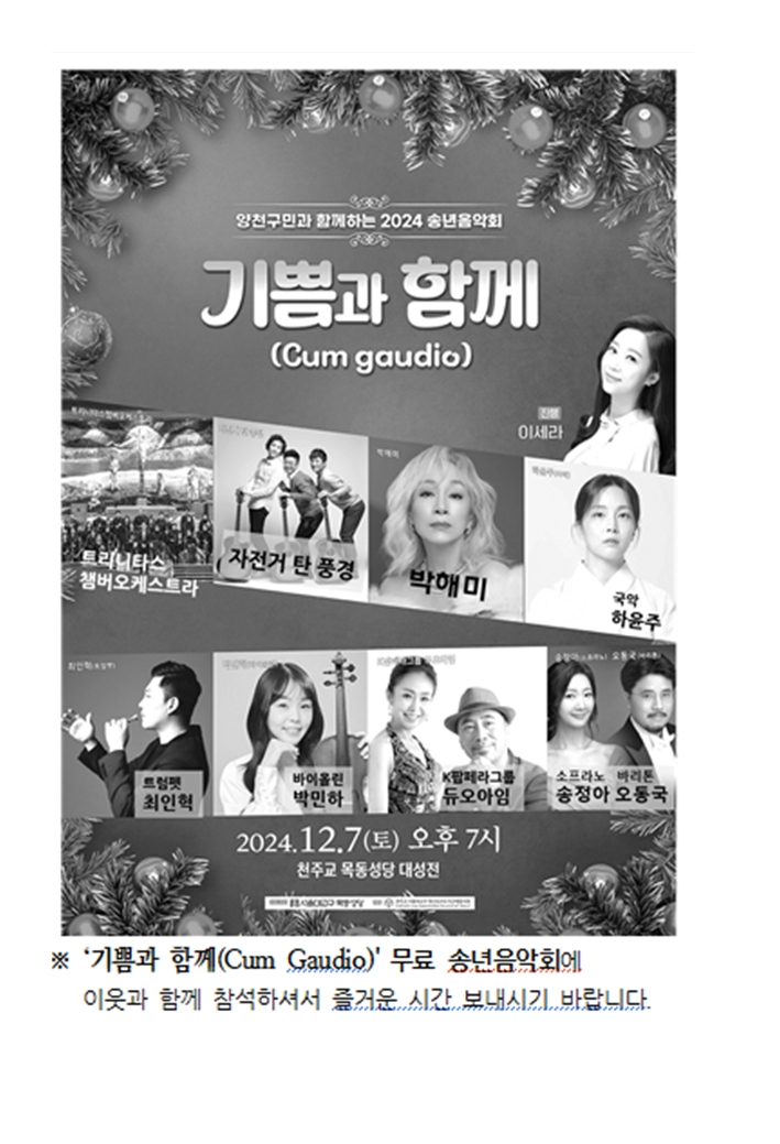 양천구민과 함께 하는 2024년 송년음악회 페이지 정보 작성자 사무실 댓글 0건 조회Hit 1,788회 작성일Date 24-11-14 09:30 본문 양천구민과 함께 하는 2024년 송년음악회 목록 이전글송년음악회로 인한 전례 변경 안내 24.11.21 다음글태아 축복예식 24.11.14 댓글목록 댓글목록 등록된 댓글이 없습니다.