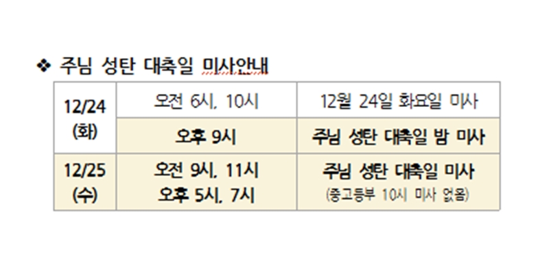 주님 성탄 대축일 미사안내 페이지 정보 작성자 사무실 댓글 0건 조회Hit 1,265회 작성일Date 24-12-05 09:16 본문 주님 성탄 대축일 미사안내 목록 이전글주일학교 학생에게 성탄 선물 주고 기도 받기 24.12.05 다음글감사드립니다! ‘기쁨과 함께(Cum Gaudio)' 송년음악회 24.12.05 댓글목록 댓글목록 등록된 댓글이 없습니다.