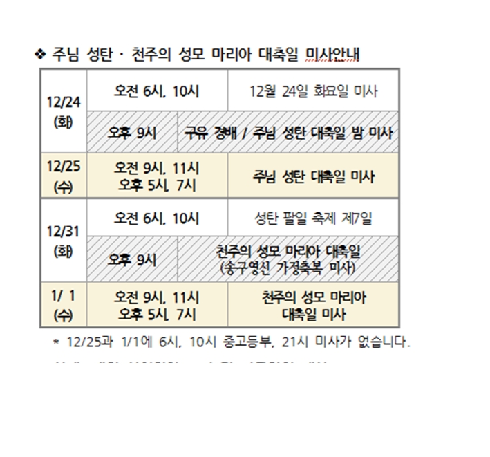 주님 성탄 · 천주의 성모 마리아 대축일 미사안내 페이지 정보 작성자 사무실 댓글 0건 조회Hit 1,183회 작성일Date 24-12-12 09:19 본문 주님 성탄 · 천주의 성모 마리아 대축일 미사안내 목록 이전글사제 수품자를 위한 54일 기도 24.12.12 다음글새 예비신자 교리반 모집 24.12.12 댓글목록 댓글목록 등록된 댓글이 없습니다.
