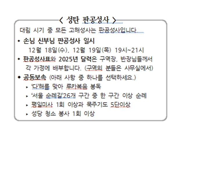 성탄 판공성사 페이지 정보 작성자 사무실 댓글 0건 조회Hit 1,332회 작성일Date 24-12-12 09:22 본문 성탄 판공성사 목록 이전글2차 헌금 24.12.12 다음글사제 수품자를 위한 54일 기도 24.12.12 댓글목록 댓글목록 등록된 댓글이 없습니다.