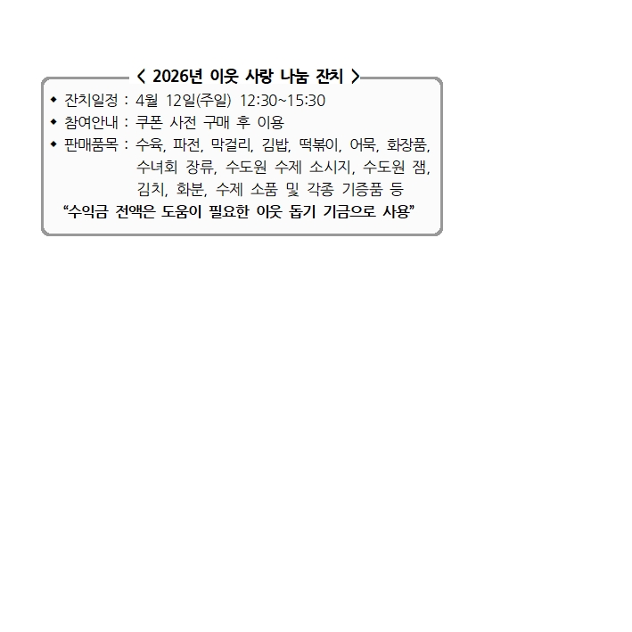 2026년 이웃 사랑 나눔 잔치 페이지 정보 작성자 사무실 댓글 0건 조회Hit 47회 작성일Date 26-03-26 13:52 본문 2026년 이웃 사랑 나눔 잔치 목록 이전글2차 헌금 26.03.26 다음글4월 첫 첨례 안내 26.03.26 댓글목록 댓글목록 등록된 댓글이 없습니다.