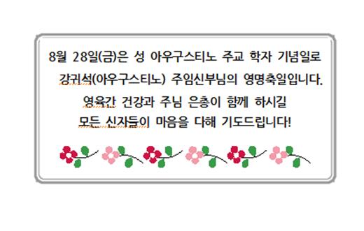 강귀석(아우구스티노) 주임신부님 영명축일 페이지 정보 작성자 사무실 댓글 0건 조회Hit 5,194회 작성일Date 20-08-20 14:18 본문 강귀석(아우구스티노) 주임신부님 영명축일 목록 이전글첫첨례 <9월> 20.08.27 다음글미사 참례시 복장과 자세 20.08.20 댓글목록 댓글목록 등록된 댓글이 없습니다.