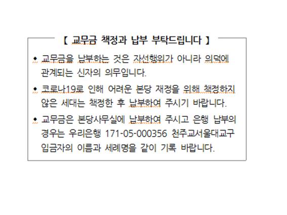 교무금 책정과 납부 부탁드립니다 페이지 정보 작성자 사무실 댓글 0건 조회Hit 4,950회 작성일Date 20-10-15 13:54 본문 교무금 책정과 납부 부탁드립니다 목록 이전글첫 영성체 20.10.15 다음글위령의 날 합동 위령미사 20.10.15 댓글목록 댓글목록 등록된 댓글이 없습니다.