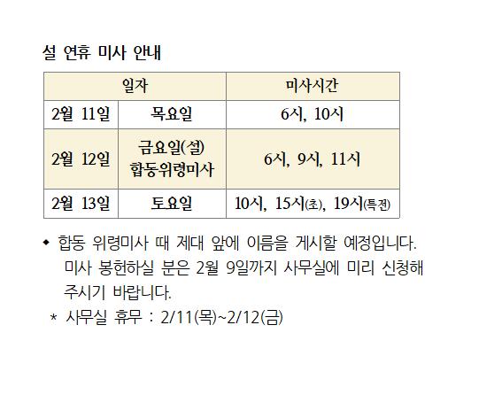 설 연휴 미사 안내 페이지 정보 작성자 사무실 댓글 0건 조회Hit 5,064회 작성일Date 21-02-03 11:41 본문 설 연휴 미사 안내 목록 이전글축하합니다. 이현철 베드로 부제 수품 21.02.03 다음글성지(聖枝) 회수 21.02.03 댓글목록 댓글목록 등록된 댓글이 없습니다.