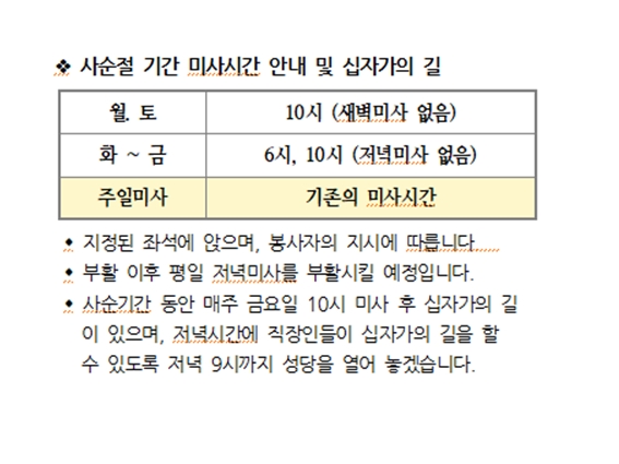 사순절 기간 미사시간 안내 및 십자가의 길 페이지 정보 작성자 사무실 댓글 0건 조회Hit 5,094회 작성일Date 21-02-17 14:10 본문 사순절 기간 미사시간 안내 및 십자가의 길 목록 이전글유아세례는 사무실로 문의 바랍니다. 21.02.25 다음글수녀님 인사이동 21.02.17 댓글목록 댓글목록 등록된 댓글이 없습니다.