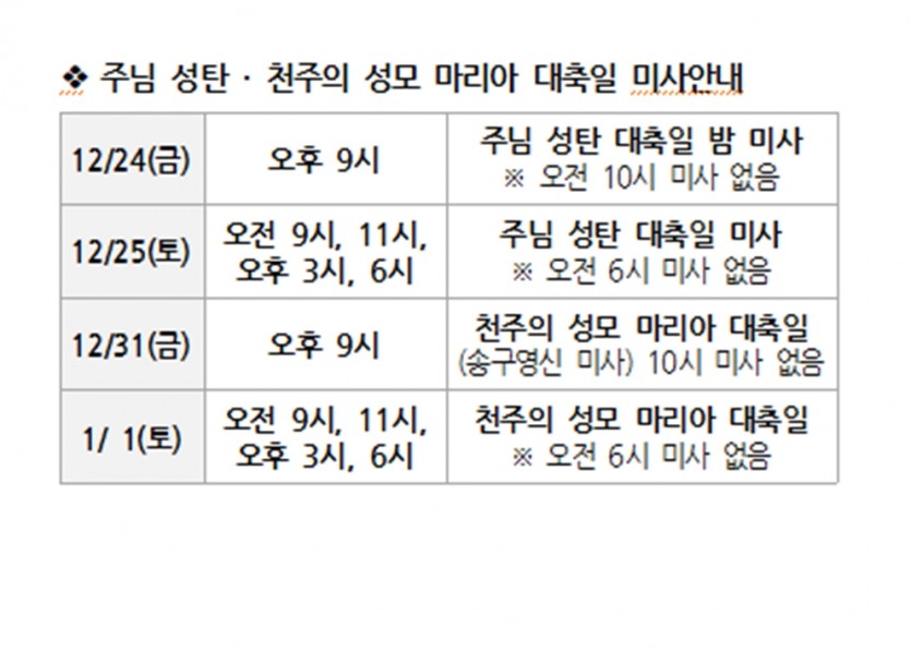 주님 성탄 · 천주의 성모 마리아 대축일 미사안내 페이지 정보 작성자 사무실 댓글 0건 조회Hit 4,948회 작성일Date 21-12-15 11:33 본문 주님 성탄 · 천주의 성모 마리아 대축일 미사안내 목록 이전글교무금 납부 및 책정 안내 21.12.23 다음글사제 · 부제 수품자를 위한 54일 기도 21.12.15 댓글목록 댓글목록 등록된 댓글이 없습니다.