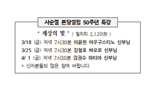 사순절 본당설립 50주년 특강 페이지 정보 작성자 사무실 댓글 0건 조회Hit 4,321회 작성일Date 22-03-03 10:13 본문 사순절 본당설립 50주년 특강 목록 이전글목동성당 50년 관련 사진 수집 22.03.09 다음글사순절 신앙 실천 22.03.03 댓글목록 댓글목록 등록된 댓글이 없습니다.