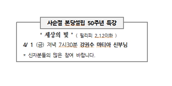 사순절 본당설립 50주년 특강 페이지 정보 작성자 사무실 댓글 0건 조회Hit 4,456회 작성일Date 22-03-24 09:58 본문 사순절 본당설립 50주년 특강 목록 이전글성주간 전례 22.04.06 다음글본당 시노드(함께하는 여정) 소식 22.03.24 댓글목록 댓글목록 등록된 댓글이 없습니다.