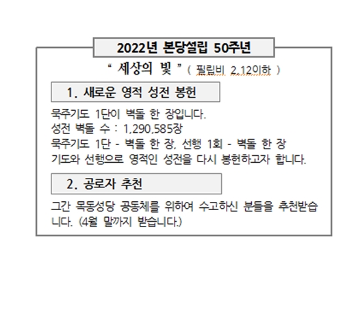 2022년 본당설립 50주년 페이지 정보 작성자 사무실 댓글 0건 조회Hit 4,526회 작성일Date 22-04-14 10:16 본문 2022년 본당설립 50주년 목록 이전글사순 저금통 22.04.21 다음글엘리야의 빵조각 (1열왕 17,8 이하) 22.04.14 댓글목록 댓글목록 등록된 댓글이 없습니다.