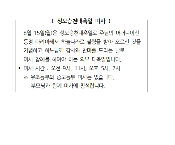 성모승천대축일 미사 페이지 정보 작성자 사무실 댓글 0건 조회Hit 4,457회 작성일Date 22-07-28 09:25 본문 성모승천대축일 미사 목록 이전글미사 참례시 복장과 자세 22.07.28 다음글혹서기 전례 안내 22.07.20 댓글목록 댓글목록 등록된 댓글이 없습니다.