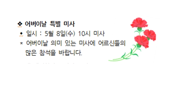 어버이날 특별 미사 페이지 정보 작성자 사무실 댓글 0건 조회Hit 2,922회 작성일Date 24-04-25 09:47 본문 어버이날 특별 미사 목록 이전글5월 첫 첨례 안내 24.04.25 다음글성모님의 밤은 5월 17일 금요일 오후 8시입니다. 24.04.25 댓글목록 댓글목록 등록된 댓글이 없습니다.
