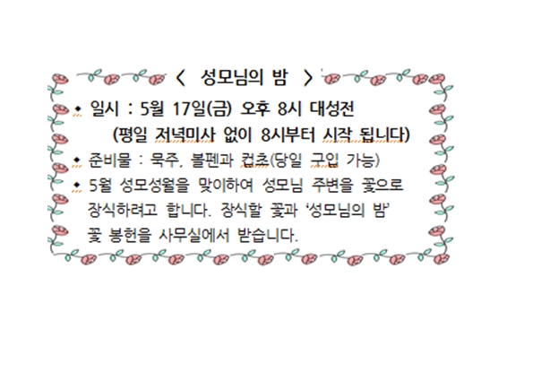 성모님의 밤 페이지 정보 작성자 사무실 댓글 0건 조회Hit 2,717회 작성일Date 24-05-01 11:08 본문 성모님의 밤 목록 이전글본당 사무실 휴무 안내 24.05.01 다음글태아 축복예식 24.04.25 댓글목록 댓글목록 등록된 댓글이 없습니다.