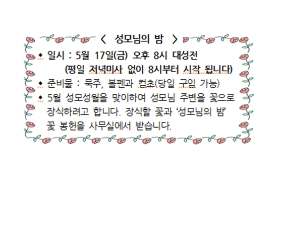 성모님의 밤 페이지 정보 작성자 사무실 댓글 0건 조회Hit 2,892회 작성일Date 24-05-09 13:42 본문 성모님의 밤 목록 이전글무지카사크라서울 합창단과 함께하는 성음악 미사와 작은 음악회 24.05.16 다음글2차 헌금 24.05.09 댓글목록 댓글목록 등록된 댓글이 없습니다.