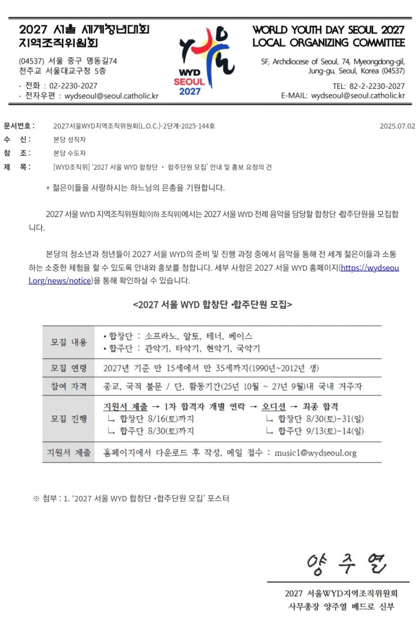[청년-WYD 조직위] 2027 서울 WYD 합창단, 합주단원 모집 안내(~8/16, 8/30)