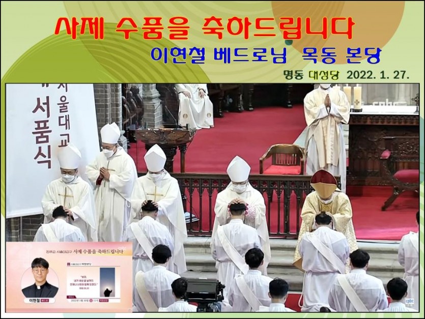 사제 수품 축하 페이지 정보 작성자 김사도요한 댓글 0건 조회Hit 1,952회 작성일Date 22-02-02 17:49 본문 이현철 베드로님 사제 수품을 축하합니다. 목록 이전글부제 수품 축하 22.02.06 다음글'악마 묵주'로 기도하고 있지 않으신가요? 22.01.18 댓글목록 댓글목록 등록된 댓글이 없습니다.