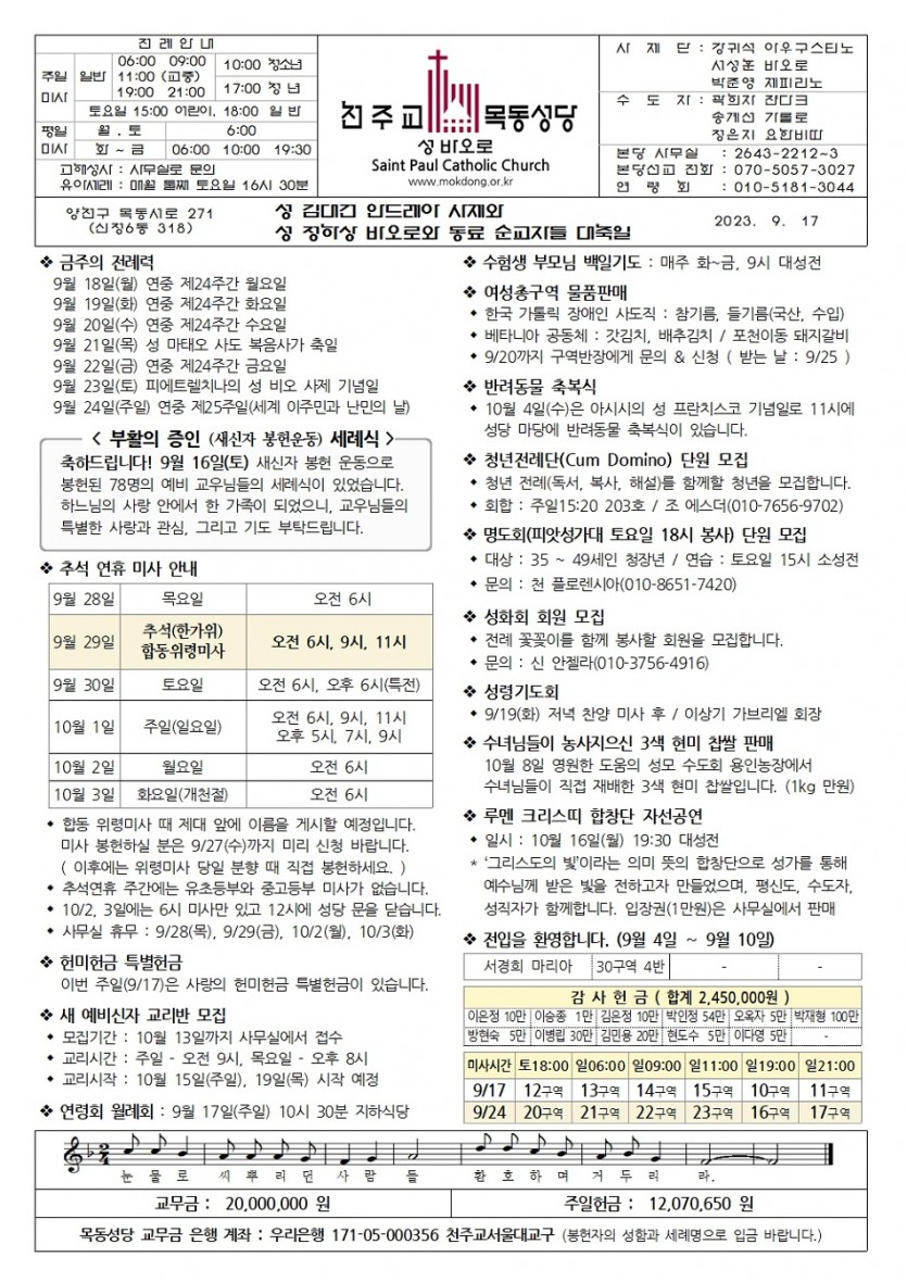 2023 2023년 9월 17일 성 김대건 안드레아 사제와 성 정하상 바오로와 동료 순레자들 대축일 경축 이동 (연중 제24주일)