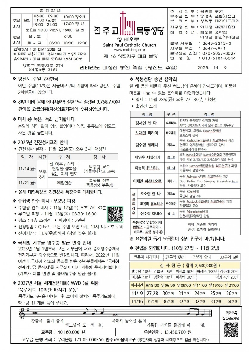 2025 2025년 11월 9일 라테라노 대성전 봉헌 축일 (평신도주일) 페이지 정보 작성자사무실 댓글 0건 작성일Date 25-11-06 11:14 본문 2025년 11월 9일 라테라노 대성전 봉헌 축일 (평신도주일) 목록 이전글2025년 11월 16일 연중 제33주일 (세계 가난한 이의 날) 25.11.13 다음글2025년 11월2일 죽은 모든 이를 기억하는 위령의 날 25.10.30 댓글목록 댓글목록 등록된 댓글이 없습니다.