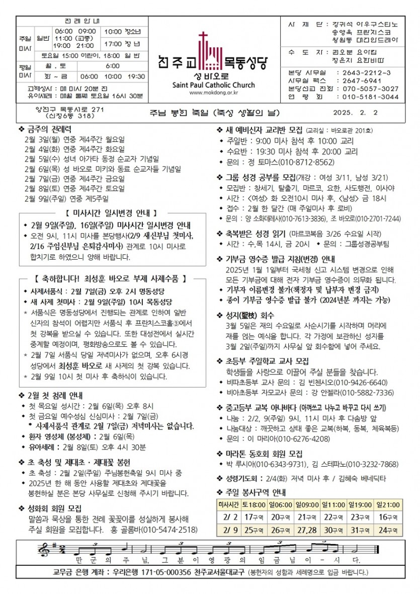 2025 2025년 2월 2일 주님 봉헌 주일.축성 생활의 날 페이지 정보 작성자사무실 댓글 0건 작성일Date 25-02-02 08:38 본문 2025년 2월 2일 주님 봉헌 주일.축성 생활의 날 목록 이전글2025년 2월 9일 연중 제5주일 25.02.06 다음글2025년 1월 26일 연중 제3주일. 하느님의 말씀 주일. 해외 원조 주일 25.01.23 댓글목록 댓글목록 등록된 댓글이 없습니다.