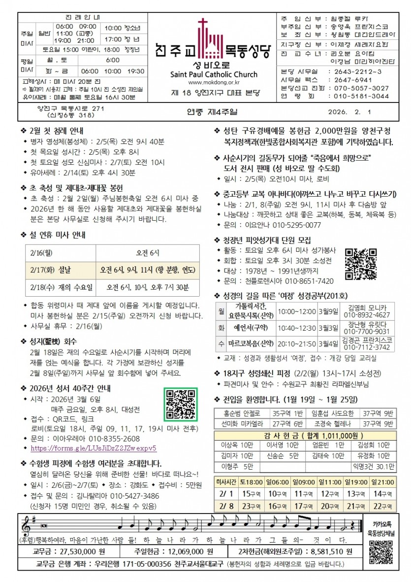 2026 2026년 2월 1일 연중 제4주일 페이지 정보 작성자사무실 댓글 0건 작성일Date 26-01-29 13:38 본문 2026년 2월 1일 연중 제4주일 검색 목록 이전글2026년 2월 8일 연중 제5주일 26.02.05 다음글2026년 1월 25일 연중 제3주일, 하느님의 말슨 주일, 해외 원조 주일 26.01.22 댓글목록 댓글목록 등록된 댓글이 없습니다.