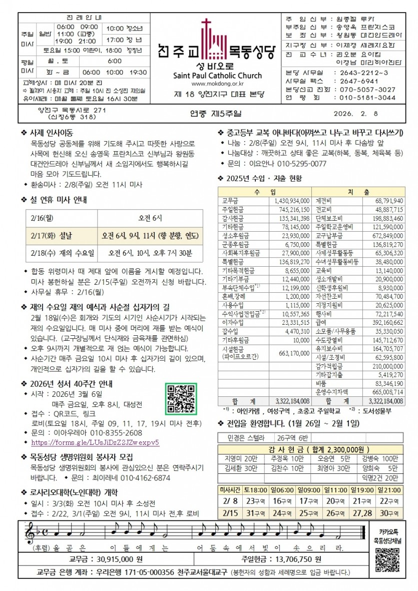 2026 2026년 2월 8일 연중 제5주일 페이지 정보 작성자사무실 댓글 0건 작성일Date 26-02-05 11:02 본문 2026년 2월 8일 연중 제5주일 검색 목록 이전글2026년 2월 15일 연중 제6주일 26.02.12 다음글2026년 2월 1일 연중 제4주일 26.01.29 댓글목록 댓글목록 등록된 댓글이 없습니다.