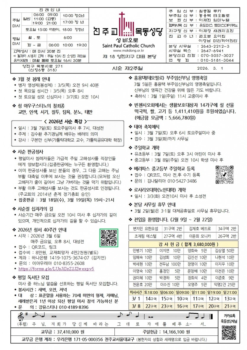 2026 2026년 3월 1일 사순 제2주일 페이지 정보 작성자사무실 댓글 0건 작성일Date 26-02-26 14:33 본문 2026년 3월 1일 사순 제2주일 검색 목록 다음글2026년 2월 22일 사순 제1주일 26.02.21 댓글목록 댓글목록 등록된 댓글이 없습니다.