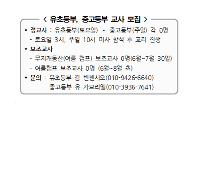 유초등부, 중고등부 교사 모집 페이지 정보 작성자 사무실 댓글 0건 조회Hit 824회 작성일Date 25-05-29 09:35 본문 유초등부, 중고등부 교사 모집 목록 이전글성령기도회 25.05.29 다음글아임카렘 북카페 봉사자 모집 25.05.29 댓글목록 댓글목록 등록된 댓글이 없습니다.