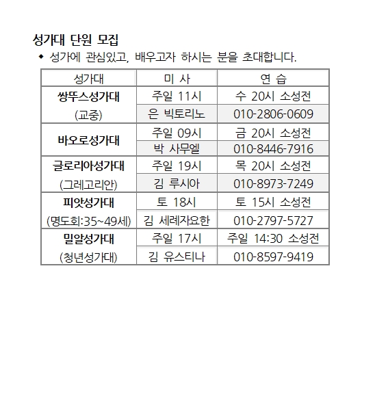 성가대 단원 모집 페이지 정보 작성자 사무실 댓글 0건 조회Hit 1,037회 작성일Date 25-04-24 10:39 본문 성가대 단원 모집 목록 이전글아임카렘 북카페 봉사자 모집 25.04.24 다음글성령기도회 25.04.17 댓글목록 댓글목록 등록된 댓글이 없습니다.