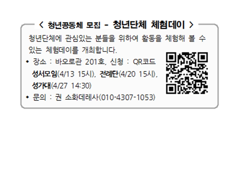 청년공동체 모집 - 청년단체 체험데이 페이지 정보 작성자 사무실 댓글 0건 조회Hit 1,252회 작성일Date 25-03-20 13:37 본문 청년공동체 모집 - 청년단체 체험데이 목록 이전글아치에스 행사 25.03.20 다음글군입대 자녀 부활 선물 발송 (군종후원회) 25.03.20 댓글목록 댓글목록 등록된 댓글이 없습니다.