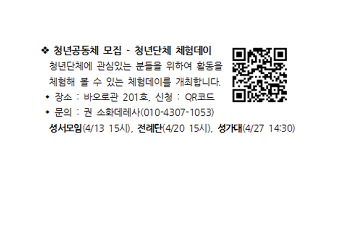 청년공동체 모집 - 청년단체 체험데이 페이지 정보 작성자 사무실 댓글 0건 조회Hit 1,227회 작성일Date 25-03-27 10:55 본문 청년공동체 모집 - 청년단체 체험데이 목록 이전글남성 그룹성경공부 & 쌍뚜스성가대 단원 모집 25.03.27 다음글아치에스 행사 25.03.20 댓글목록 댓글목록 등록된 댓글이 없습니다.