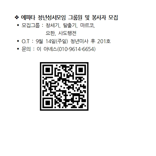 에파타 청년성서모임 그룹원 및 봉사자 모집 페이지 정보 작성자 사무실 댓글 0건 조회Hit 769회 작성일Date 25-09-04 13:12 본문 에파타 청년성서모임 그룹원 및 봉사자 모집 목록 이전글대입 수험생을 위한 백일기도(8/5~11/12) 25.09.04 다음글18지구 성령쇄신 피정 (9/1(월) 13시~17시 소성전) 25.08.28 댓글목록 댓글목록 등록된 댓글이 없습니다.