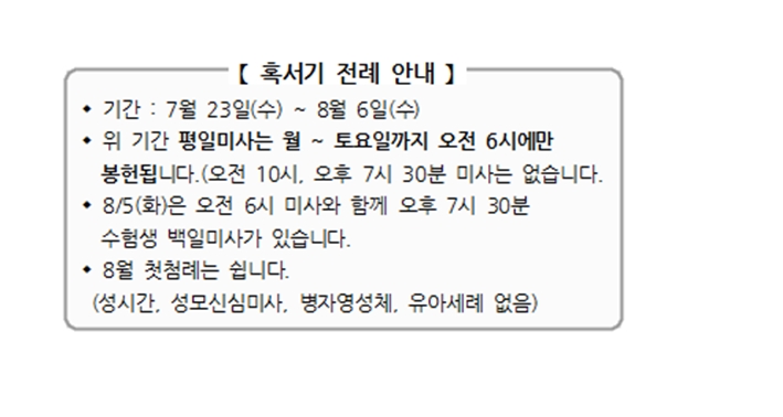 혹서기 전례 안내 페이지 정보 작성자 사무실 댓글 0건 조회Hit 859회 작성일Date 25-07-10 10:29 본문 혹서기 전례 안내 목록 이전글미사 중 녹음, 녹화 금지합니다. 25.07.10 다음글가족미사 함께 참여하기 운동 25.07.10 댓글목록 댓글목록 등록된 댓글이 없습니다.