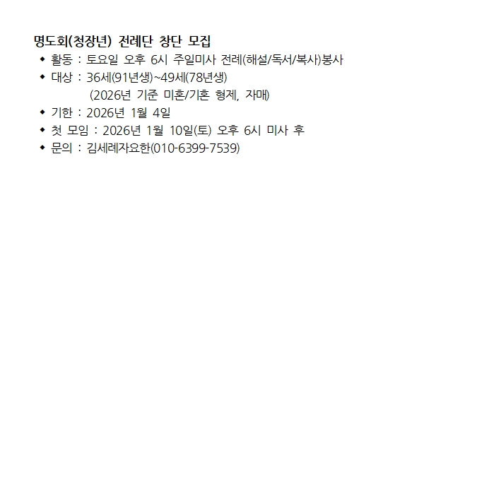 명도회(청장년) 전례단 창단 모집 페이지 정보 작성자 사무실 댓글 0건 조회Hit 569회 작성일Date 25-12-20 13:32 본문 명도회(청장년) 전례단 창단 모집 목록 이전글중고등부주일학교 성탄맞이 물품판매 25.12.20 다음글청년 밀알성가대 단원 모집 25.12.20 댓글목록 댓글목록 등록된 댓글이 없습니다.