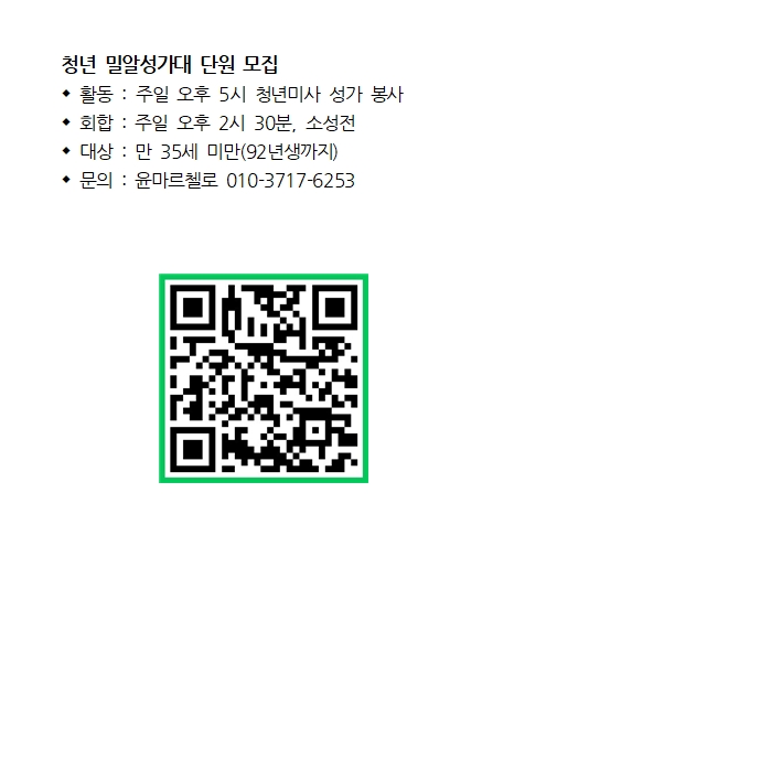 청년 밀알성가대 단원 모집 페이지 정보 작성자 사무실 댓글 0건 조회Hit 551회 작성일Date 25-12-25 18:24 본문 청년 밀알성가대 단원 모집 목록 이전글명도회(청장년) 전례단 창단 모집 26.01.01 다음글청년전례단 : 꿈 도미노(Cum Domino) 단원 모집 25.12.25 댓글목록 댓글목록 등록된 댓글이 없습니다.