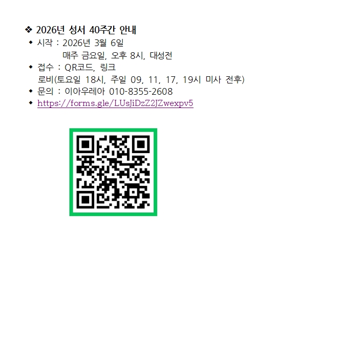 2026년 성서 40주간 안내 페이지 정보 작성자 사무실 댓글 0건 조회Hit 341회 작성일Date 26-01-29 13:28 본문 2026년 성서 40주간 안내 목록 이전글18지구 성령쇄신 피정 26.01.29 다음글청장년 피앗성가대 단원 모집 26.01.29 댓글목록 댓글목록 등록된 댓글이 없습니다.