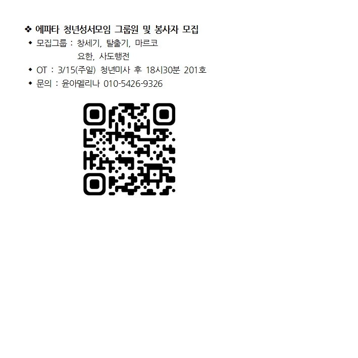 에파타 청년성서모임 그룹원 및 봉사자 모집 페이지 정보 작성자 사무실 댓글 0건 조회Hit 166회 작성일Date 26-03-12 09:47 본문 에파타 청년성서모임 그룹원 및 봉사자 모집 목록 이전글군입대 자녀 부활 선물 발송 (군종후원회) 26.03.12 다음글축하합니다! 평화의 모후Pr. 2000차 주회 26.03.12 댓글목록 댓글목록 등록된 댓글이 없습니다.