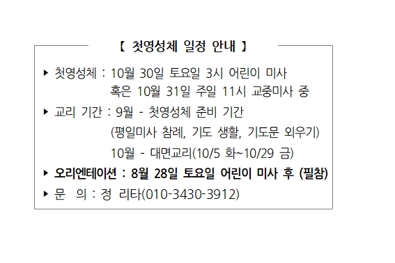 첫영성체 일정 안내 페이지 정보 작성자 사무실 댓글 0건 조회Hit 3,543회 작성일Date 21-08-26 13:43 본문 첫영성체 일정 안내 목록 이전글첫영성체 21.09.04 다음글수험생 부모님 백일기도 모임 21.08.19 댓글목록 댓글목록 등록된 댓글이 없습니다.