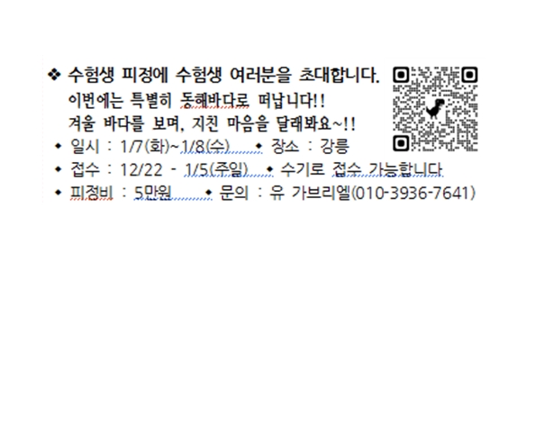 수험생 피정에 수험생 여러분을 초대합니다. 페이지 정보 작성자 사무실 댓글 0건 조회Hit 1,125회 작성일Date 24-12-19 11:40 본문 수험생 피정에 수험생 여러분을 초대합니다. 목록 이전글성령기도회 24.12.26 다음글성령기도회 24.12.19 댓글목록 댓글목록 등록된 댓글이 없습니다.