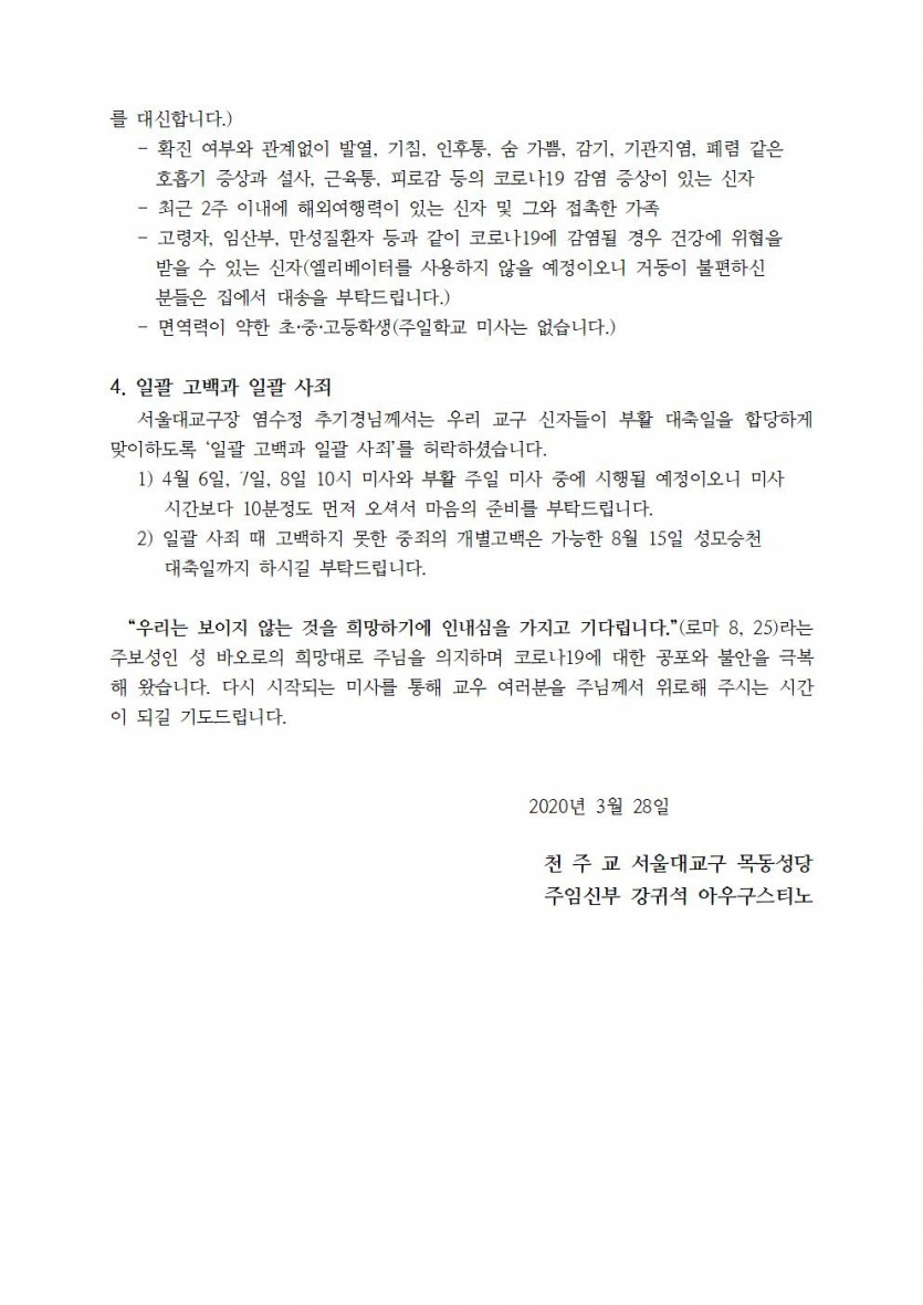 두 번째 목동성당 신자분들에게 드리는 당부의 말씀 페이지 정보 작성자 홍보부 댓글 0건 조회Hit 3,143회 작성일Date 20-03-28 16:21 본문 두 번째 목동성당 신자분들에게 드리는 당부의 말씀 목록 이전글부활성사표 배부관련 20.04.01 다음글Ⅰ. 미사 재개일 연기 Ⅱ. 코로나19 관련 특별 대사 Ⅲ. 일괄 고백과 일괄 사죄 20.03.26 댓글목록 댓글목록 등록된 댓글이 없습니다.